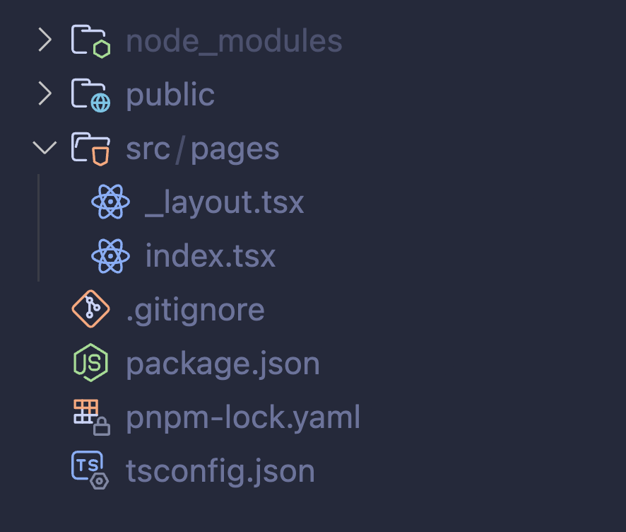 pnpm create waku@latestWe are then going to remove any unnecessary files and folders (images, styling, components). The final initial template looks as follows: