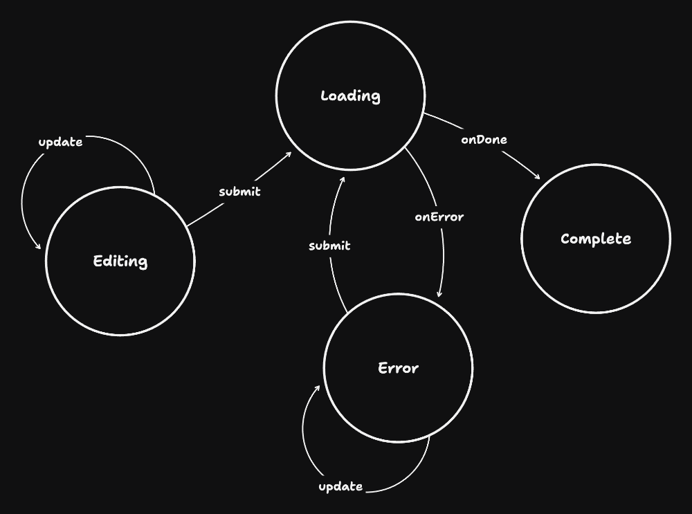 type State = "Editing" | "Loading" | "Error" | "Complete";