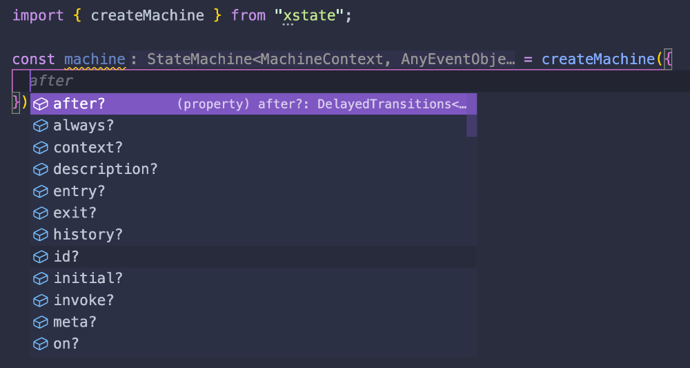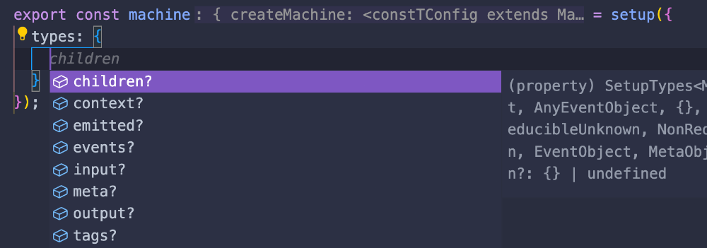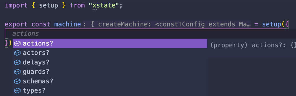 Nonetheless, since XState v5 the suggested way to define a machine is using the setup function instead, and then calling createMachine from it.